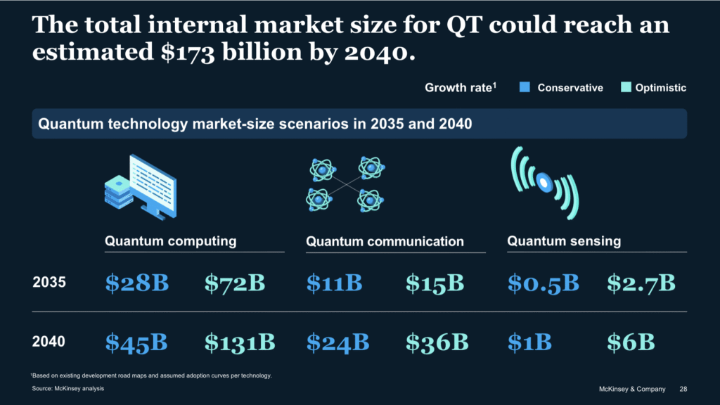 McKinsey estimates that by 2035, quantum technologies could unlock $2 trillion in economic value, with life sciences, finance, chemicals, and transportation as early beneficiaries. By 2040, the combined market size of Quantum Computing, Communication, and Sensing is expected to hit $173 billion.
